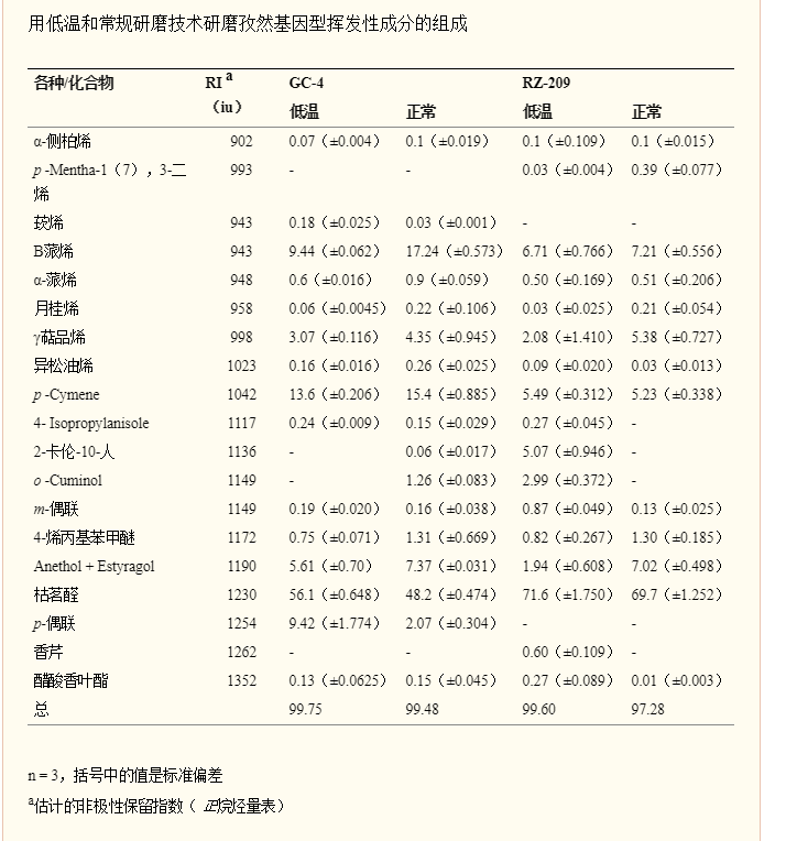 低溫超微粉碎機的低溫研磨和非低溫研磨孜然基因型完整種子的基本和脂肪油百分比。 與RZ 209(3.3%)相比,基因型GC 4的完整種子中的精油百分比更大(4.0%)。 非低溫研磨導致GC 4基因型中揮發(fā)油損失23.2%,RZ 209中揮發(fā)油損失24.3%。有趣的是,低溫研磨不僅保留了兩種基因型中的揮發(fā)物,而且提高了GC 4中33.9%的回收率和43.4%的回收率。 報道了類似的結果,與低溫和甚至完整的種子相比,低溫地面種子精油的回收率更高。 分析低溫研磨對九種芫荽基因型的影響。 由于研磨過程中的低溫,揮發(fā)性精油的損失最小或可忽略不計。 回收比完整種子中存在的更多精油可能是由于完整種子中的油體在研磨過程中變得自由,并且從粉末樣品中提取油而不是完整種子變得容易。
