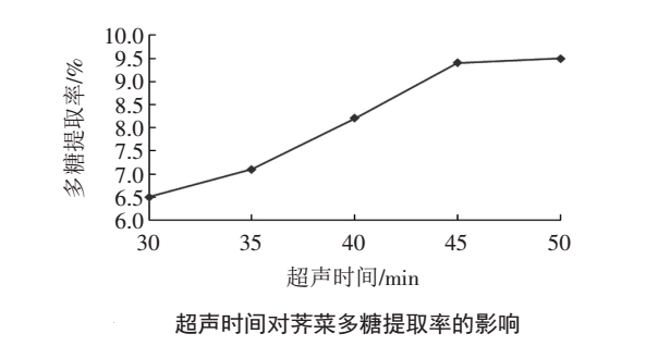 取過150目篩的薺菜干粉、在料液比1:25(g/ml)、超聲功率 300w條件下,考察不同的超聲時(shí)間 30、35、40、45、50 min 對(duì)多糖提取率的影響,以多糖提取率為縱坐標(biāo)、超聲時(shí)間為橫坐標(biāo)制圖,見下圖。