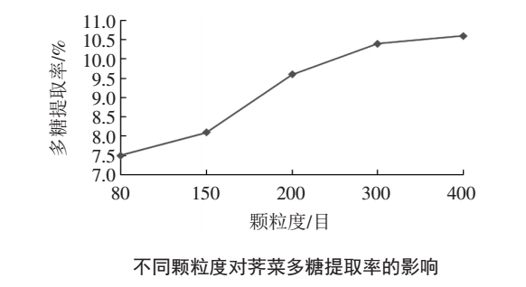 在料液比1:25(g/ml)、超聲時(shí)間45min、超聲功率300w 條件下,薺菜干粉顆粒度分別為 80、150、200、300、400 目,測(cè)定多糖提取率,以多糖提取率為縱坐標(biāo)、顆粒度為橫坐標(biāo)制圖,見下圖。