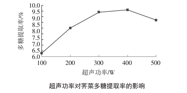 在料液比1:25(g/ml)、超聲時(shí)間45min、顆粒度300目條件下,考察不同超聲功率 100、200、300、400、500 W 對(duì)多糖提取率的影響,以多糖提取率為縱坐標(biāo)、超聲功率為橫坐標(biāo)制圖,見下圖。