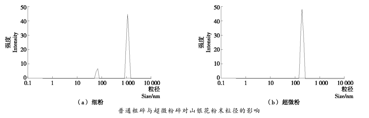 山銀花細粉形狀各異,粒徑較大,表面較粗糙。經(jīng)過超微粉碎后,山銀花原片狀結(jié)構(gòu)被切斷,呈現(xiàn)粒徑較小、形狀多為圓錐形或束形、纖維單個散在或數(shù)個成束的微粒結(jié)構(gòu)特性。由圖可知,經(jīng)過普通粉碎的山銀花顆粒分布范圍較廣,平均粒徑為3368nm(分散系數(shù)PDI為0.817),經(jīng)過超微粉碎的山銀花顆粒平均粒徑為535.5nm(分散系數(shù)PDI為0.540)?梢,經(jīng)過超微粉碎后,其粒徑分布區(qū)域變窄。研究發(fā)現(xiàn),超微粉碎通過剪切力改變了物料大小,未有效改變纖維的結(jié)晶結(jié)構(gòu),只是改變纖維的顆粒大小。經(jīng)超微粉碎后,粒徑減小,同時粉碎過程中纖維等大分子長鏈發(fā)生斷裂,使得羧基、羥基等基團充分暴露出來,從而改善其物化特性。