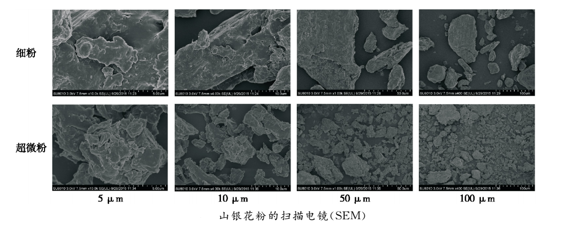 山銀花超微粉和細粉的掃描電鏡(SEM)如圖所示。