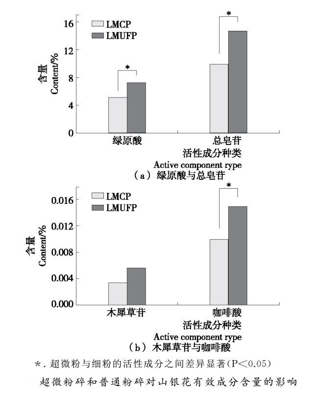 2 超微粉碎和普通粉碎對山銀花的有效活性成分含量的影響
