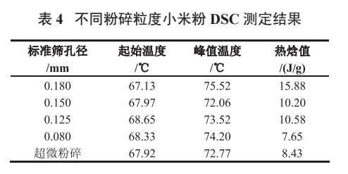 由表4可以看出,不同粒度的小米粉起始溫度在67.13~68.65 ℃之間,峰值溫度在72.06~75.52 ℃,熱焓在 7.65~15.88 J/g。在分析軟件上可以顯示,這幾個(gè)粒度的小米粉起始溫度相差不多,峰值溫度略有差別,但是熱焓值變化較大,0.180mm 篩分粉的熱焓值最大為 15.88 J/g,而其他篩分粉和超微粉碎的相差不大,隨著顆粒變細(xì)熱焓值相應(yīng)變小。這與錢建亞等的研究結(jié)果相一致,RVA 和 DSC的測(cè)定結(jié)果受到樣品細(xì)度的影響且 DSC 測(cè)定的糊化溫度低于 RVA。