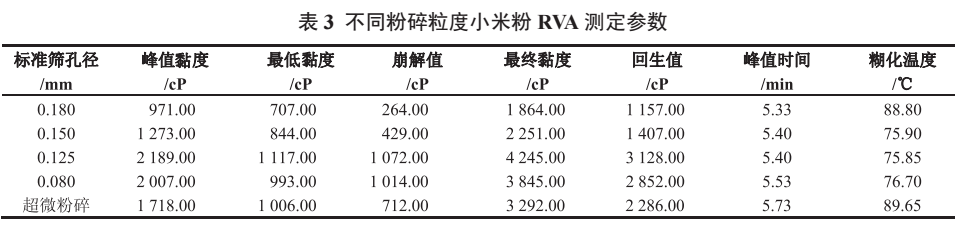 采用快速黏度測(cè)定儀(RVA)測(cè)定不同粒度的小米粉的糊化曲線,從表3可以看出小米粉的峰值黏度、最低黏度、崩解值、最終黏度、回生值均隨著粒度的變小而呈現(xiàn)先上升后下降的趨勢(shì),0.125mm 篩分的小米粒均為最大值;比較5種粒度小米粉的峰值時(shí)間發(fā)現(xiàn),小米粉粒徑越小,達(dá)到峰值時(shí)間越長(zhǎng),超微粉碎的峰值時(shí)間最大;而超微粉碎小米粉的糊化溫度也最高,為 89.65℃。普通粉碎過不同孔徑標(biāo)準(zhǔn)篩篩分的粒度中,0.180 mm篩分粒度的糊化溫度大于 0.150、0.125、0.080 mm篩分粒度。
