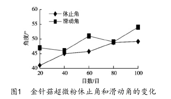 由圖1看出,在20-100目范圍內(nèi),金針菇粉體的休止角和滑動角隨粒徑的減小總體呈上升趨勢。這是因為隨著粉體粒度的減小,粉粒的比表面積不斷增大,表面聚合力和黏著力也相應(yīng)增強,粉粒發(fā)生團聚流動性變差。由此可見,20目微粉的流動性最好,100目微粉的流動性最差。