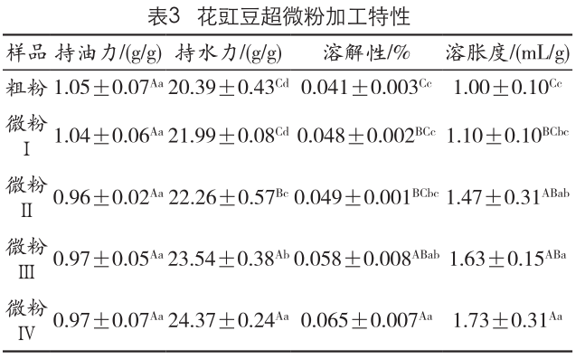 由表1可知,超微粉碎改變了花豇豆粉的顆粒大小,使粉體更加細(xì)膩、均勻。粗粉的平均粒徑為(284.312±0.004)μm,58.07%的顆粒直徑大于200 μm,18.69%的顆粒直徑在(100~200)μm。超微粉碎后,花豇豆超微粉的平均粒徑為(20.857~29.507)μm,71.19%~86.57%的顆粒直徑小于50μm,且32.15%~35.67%的顆粒直徑小于20 μm。