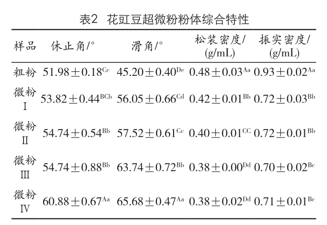 由表2可知,與粗粉相比,花豇豆超微粉的休止角和滑角隨著粉碎時(shí)間的延長而逐漸增加;休止角由(51.98±0.18)°增大到(60.88±0.67)°,滑角由(45.20±0.40)°增大到(65.68±0.47)°;表明花豇豆超微粉流動(dòng)性變差,原因?yàn)槌⒎鬯槭够狗鄯垠w顆粒的比表面積增大,顆粒表面所具有的表面能也增大,顆粒間結(jié)合更加緊密。隨著粉碎時(shí)間的延長,花豇豆超微粉的松裝密度和振實(shí)密度均呈下降趨勢;松裝密度由(0.48±0.03)g/mL減少到(0.38±0.02)g/mL,振實(shí)密度由(0.93±0.02)g/mL減少到(0.71±0.01)g/mL;原因?yàn)槌⒎鄯垠w顆粒越細(xì),空隙率越大,能夠夾帶更多的空氣,粉體體積增大。因此,在質(zhì)量相同的情況下,與粗粉相比,超微粉的松裝密度和振實(shí)密度均降低。
