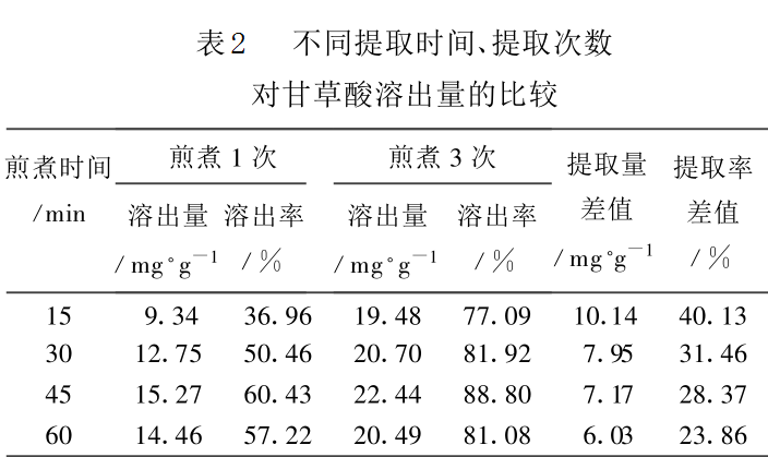 1.由表1可看出超微粉碎32min的甘草飲片微粉浸泡20min的溶出率略高于常規(guī)飲片煎煮30min的提取率率,超微粉碎40min的甘草飲片微粉浸泡20min的溶出率略高于常規(guī)飲片煎煮45,60min的提取率,提示上述條件超微粉碎的甘草飲片有助于甘草酸的提取,浸泡1次的溶出率就可達(dá)到60%以上。但與煎煮3次(每次45min)的提取率相比仍有一定差距,可前者的時(shí)間效能比確高于后者。