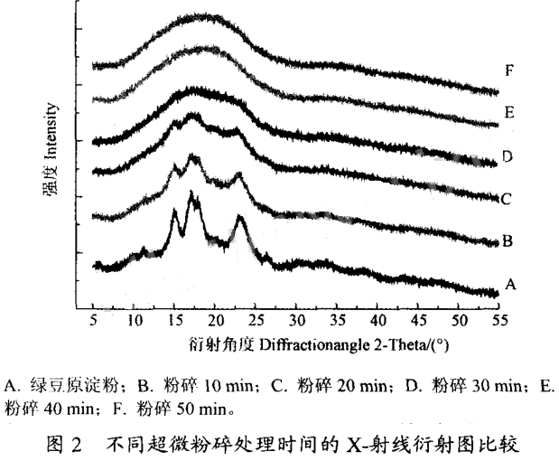 不同超微粉碎時(shí)間處理的綠豆淀粉的x.射線衍射圖如圖2、結(jié)晶度如表1,從圖2、表1可以看出,隨著處理時(shí)間的增加,衍射曲線中的尖峰衍射特征逐漸減弱,半峰寬增寬,峰強(qiáng)度降低,結(jié)晶度從32.6%降到5.4%,晶體的有序化程度降低,無(wú)定形化程度逐漸增強(qiáng),結(jié)晶顆粒被破壞。處理至40~50min時(shí),尖峰衍射特征基本消失,變成饅頭峰,即呈現(xiàn)無(wú)定形結(jié)構(gòu)衍射曲線,說(shuō)明處理至40~50min時(shí)綠豆淀粉顆粒的結(jié)晶結(jié)構(gòu)受到嚴(yán)重破壞,表明機(jī)械力效應(yīng)對(duì)綠豆淀粉顆粒具有非晶化的作用。