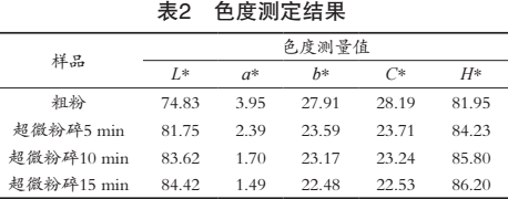 不同超微粉碎時(shí)間對(duì)芒果皮顏色的影響見表2,從表中結(jié)果可知,3種超微粉色度各測(cè)量值非常相近,與粗粉有差異。超微粉的L*值和H*值比粗粉的值大,而a*值、b*值和C*值減小。表明與粗粉的顏色相比,超微粉的亮度更白亮。超微粉色澤改變主要由于其粒徑的減小,顆粒間混合更均勻,同時(shí)隨著比表面積的增大,物料中的膳食纖維等內(nèi)容物逐漸顯露出來,從而影響到超微粉的顏色。