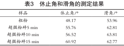 粉體的休止角和滑角是表征粉體狀態(tài)的一項(xiàng)基本指標(biāo),對(duì)粉體的加工特性有較大影響。由表3可知,超微粉的休止角、滑角均大于粗粉,休止角和滑角越大,表明粉體的流動(dòng)性越好,因此,芒果皮超微粉隨著粉體粒度變小,粉體流動(dòng)性變好,這可能是由于微粒具有吸附和凝聚特性引起表面聚合力增大,吸附性能增強(qiáng)所致。
