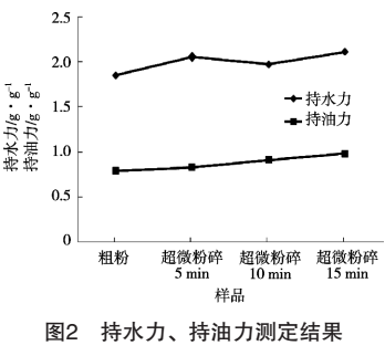 芒果皮超微粉的持水力和持油力結(jié)果如圖2所示,由圖可知,芒果皮粗粉持水力和持油力分別為1.85 g/g和0.79 g/g,超微粉15 min的持水力和持油力分別為2.11 g/g和0.98 g/g。超微粉隨著超微時間的增加,芒果皮超微粉粒徑的不斷減小,持水力和持油力提高,其中持水力更為明顯。可能原因是在超微粉碎的作用下,芒果皮的組織結(jié)構(gòu)被疏松,顆粒的比表面積、表面能和孔隙率提高,并且在超微粉碎作用下部分細(xì)胞破碎,纖維素和半纖維素中更多的親水性基團(tuán)暴露出來,顆粒與水的接觸面積、接觸部位增多,其分散性增強(qiáng),因而持水力和持油力提高。