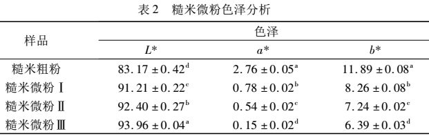 糙米微粉色澤分析結(jié)果見(jiàn)表2.與糙米粗粉相比,隨著粉碎時(shí)間的延長(zhǎng),微粉的L*值顯著增大,a*值和b*值均顯著減。话愎任锓f果的皮層或麩皮中含有維生素、植酸和少量色素,如花色苷和原花青素等植物色素,會(huì)使谷物食品的表面顏色較深,這與傳統(tǒng)觀念中精白米和面的白色不符,影響谷物食品的推廣.與普通精致白米相比,糙米顏色較深.但經(jīng)過(guò)超微粉碎處理后,微粉粒徑減小,糙米中的主要成分淀粉和蛋白質(zhì)也顯露出來(lái),不同顏色的顆粒間相互混合,紅色和黃色均明顯減弱,微粉顏色更為白亮、更均勻,這將有助于改善糙米食品的色澤品質(zhì).