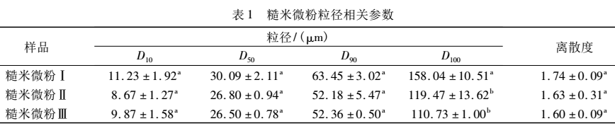糙米食品開(kāi)發(fā)與推廣的關(guān)鍵問(wèn)題在于口感粗糙.研究表明對(duì)食品中顆;虍愇锏母兄饕煽谇煌瓿桑谇粚(duì)顆粒粒度的感知閾約為50μm,如果能夠?qū)⒃狭6葴p小到50μm左右,將可以改善糙米食品的口感.糙米微粉粒徑分析結(jié)果見(jiàn)圖1和表1.因糙米粗粉顆粒粒徑超出粒度儀的測(cè)量范圍為0~350μm,表未給出糙米粗粉的粒徑參數(shù),但從圖1a中可以看出,糙米粗粉大部分顆粒粒徑都在150μm以上.從表1可知,糙米粗粉經(jīng)過(guò)10min超微粉碎后,平均粒徑D50減小到(30.09±2.11)μm,達(dá)到超微粉級(jí)別,表明振動(dòng)式超微粉碎機(jī)對(duì)糙米全粉有著較好的破碎作用.繼續(xù)延長(zhǎng)粉碎時(shí)間,微粉D50進(jìn)一步減小,但與粉碎10min時(shí)相比無(wú)顯著差異.D90已接近口腔對(duì)顆粒粒度的感知閾50μm,所得微粉用于食品開(kāi)發(fā)將可以改善口感,這還需通過(guò)產(chǎn)品來(lái)進(jìn)行驗(yàn)證.研究表明肉眼能夠感知的最小顆粒大約在100μm,顆粒的減小還能夠改善食品的表觀品質(zhì).離散度反映樣品粒徑的分布情況,離散度值小表示粒度分布范圍窄,過(guò)大和過(guò)小的顆粒較少,粉體較均勻.根據(jù)計(jì)算的離散度值可知,隨著粉碎時(shí)間延長(zhǎng),微粉離散度逐漸減小,但差異不顯著.從圖1b,c,d中也可以看出,3種微粉的粒徑分布圖基本一致,說(shuō)明粉碎時(shí)間為20~30min時(shí),已經(jīng)接近振動(dòng)式超微粉碎機(jī)對(duì)糙米的粉碎極限.