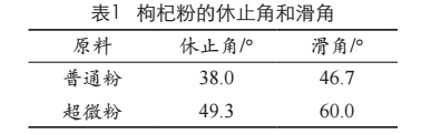 枸杞粉所具有的流動性大小與粉體的休止角和滑角有密切關系,粉體的休止角和滑角變大時,其流動性變差。枸杞普通粉和超微粉粉體的休止角和滑角見表1。