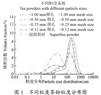 超微粉碎茶粉和4種常規(guī)粉碎茶粉的粒度見表1,超微茶粉的 D 10、D 50 和 D 90 都顯著小于常規(guī)粗粉,表明機(jī)械超微粉碎可以有效降低茶粉的粒度。鑒于植物細(xì)胞的尺度為 8~90 μm,可以看出和常規(guī)粉碎相比,超微茶粉的粒度已達(dá)到細(xì)胞級粉碎。圖1是茶粉的粒度分布圖,對比常規(guī)粉碎,超微粉碎茶粉的粒度分布圖明顯左移,表明粒度顯著減小。