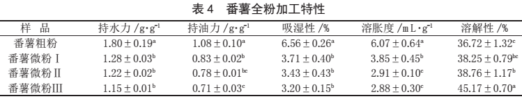 由表 4 可知,隨著超微粉碎時間的延長,與番薯粗粉相比,番薯微粉的持水力和持油力均呈逐漸降低的趨勢。隨著樣品粒徑減小,樣品內(nèi)部的多孔網(wǎng)狀結(jié)構(gòu)破壞,膳食纖維結(jié)構(gòu)受到破壞,長鏈斷裂,其中的可溶性成分溶出,對水和油的滯留能力均降低。番薯微粉的粒徑減小,細胞被破碎時粉中的水溶性成分更易溶出,對水分的束縛和吸附能力降低,與番薯粗粉相比,吸濕性和溶脹度均降低。另外,隨著粒徑的細化,番薯微粉粉體與水的接觸面積相應(yīng)增加,有利于水溶性成分充分溶解,番薯微粉溶解性高于番薯粗粉。