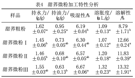 甜蕎微粉綜合特性分析結(jié)果見表3。從表3可知,隨著粉碎時間的延長,甜蕎微粉的休止角和滑角均呈現(xiàn)逐漸增大的變化趨勢。隨著粉體粒徑減小,顆粒的比表面積增大,表面聚合力及顆粒間的吸附和凝聚特性增強,使微粉的粉體流動性減弱。與粗粉相比,甜蕎微粉的松裝密度和振實密度均顯著減小。粉體顆粒越細,空隙率越大,能夠夾帶更多的空氣,粉體間空氣增多,與粗粉相比更為膨松,松裝密度和振實密度均小于粗粉。