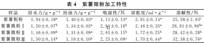 結(jié)果表明,與粗粉相比,紫薯微粉的休止角和滑角均增大,微粉的粉體流動性減弱。紫薯微粉堆積更為膨松,松裝密度和振實(shí)密度均小于粗粉。隨著超微粉碎時間的延長,粒徑的減小,紫薯微粉的持水力、持油力、吸濕性和溶脹度逐漸降低,溶解性增加。超微粉碎處理可以顯著改善紫薯全粉的顆粒均勻性、顏色均勻性、溶解性等物化特性。