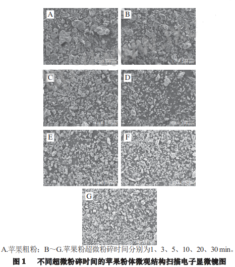 蘋果為薔薇科蘋果屬果樹。是飲食類黃酮和抗氧化劑的主要來源,富含VC和各種酚類化合物。若將干燥后的蘋果經(jīng)粗粉碎后,在不同粉碎時間(1、3、5、10、20、30 min)條件下經(jīng)低溫超微粉碎機粉碎,得到蘋果粗粉和6 種不同粒徑分布的蘋果超微粉,今天就來介紹一下蘋果粉體的粒徑分布和掃描電子顯微觀察情況。