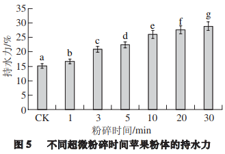 持水力是粉體親水性能的重要指標(biāo)之一,超微粉碎過程中的機械力增加了粉體顆粒的表面能,空隙率增加,活性點增多,可極大促進顆粒表面的羥基等基團與水分子的結(jié)合。由圖5可知,粗粉對照組的持水力顯著小于不同超微粉碎時間的粉體(P<0.05), 超微粉碎不同處理之間隨著粉碎時間的延長,蘋果粉體的持水力逐漸增大,各處理之間差異顯著 (P<0.05)。